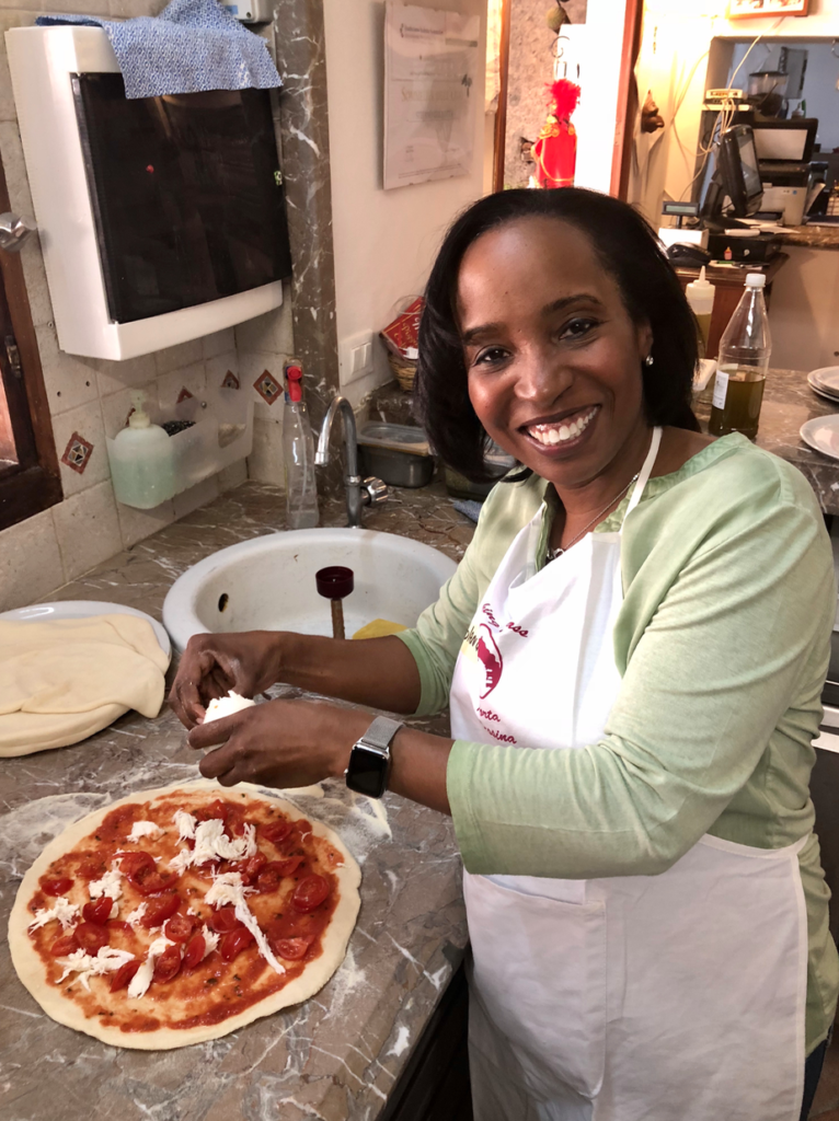 Now it was time to create our masterpieces. We traveled to the kitchen were all of the toppings for the pizza were waiting for us. The chef showed us how to shape our pizza dough. We added the sauce and then added our toppings. Of course everything was so fresh!!! I was in heaven. We then had to get our pizza onto the pizza paddle so that we could put it into the oven. This looks a lot easier than what it is. I was so worried about messing up my pizza that the chef had to take over a little for me. It made it in safely. They cook up in no time inside of these hot ovens. Literally a little over a minute and it’s ready to come out. As soon as it comes out of the oven fresh basil and olive oil is added to the hot pizzas. YUMMY!!!! After a quick cut, the pizza is ready to be devoured!!!
